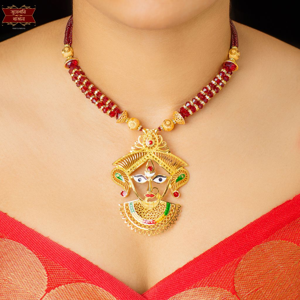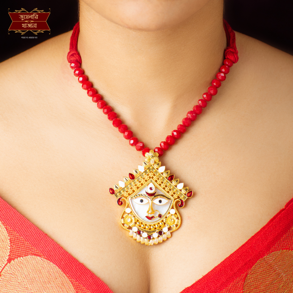 Divine Gold Plated Maa Durga Shell Pendant with Earrings
