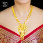 Enhance your ethnic charm with this Premium Gold Plated Purna Sitahar Set that includes a matching pair of elegant earrings. Inspired by traditional Bengali craftsmanship, this design reflects timeless heritage with a touch of modern finesse. The full-length Purna Sitahar beautifully drapes around the neckline, making it a perfect pick for weddings, festivals, or any grand occasion.
