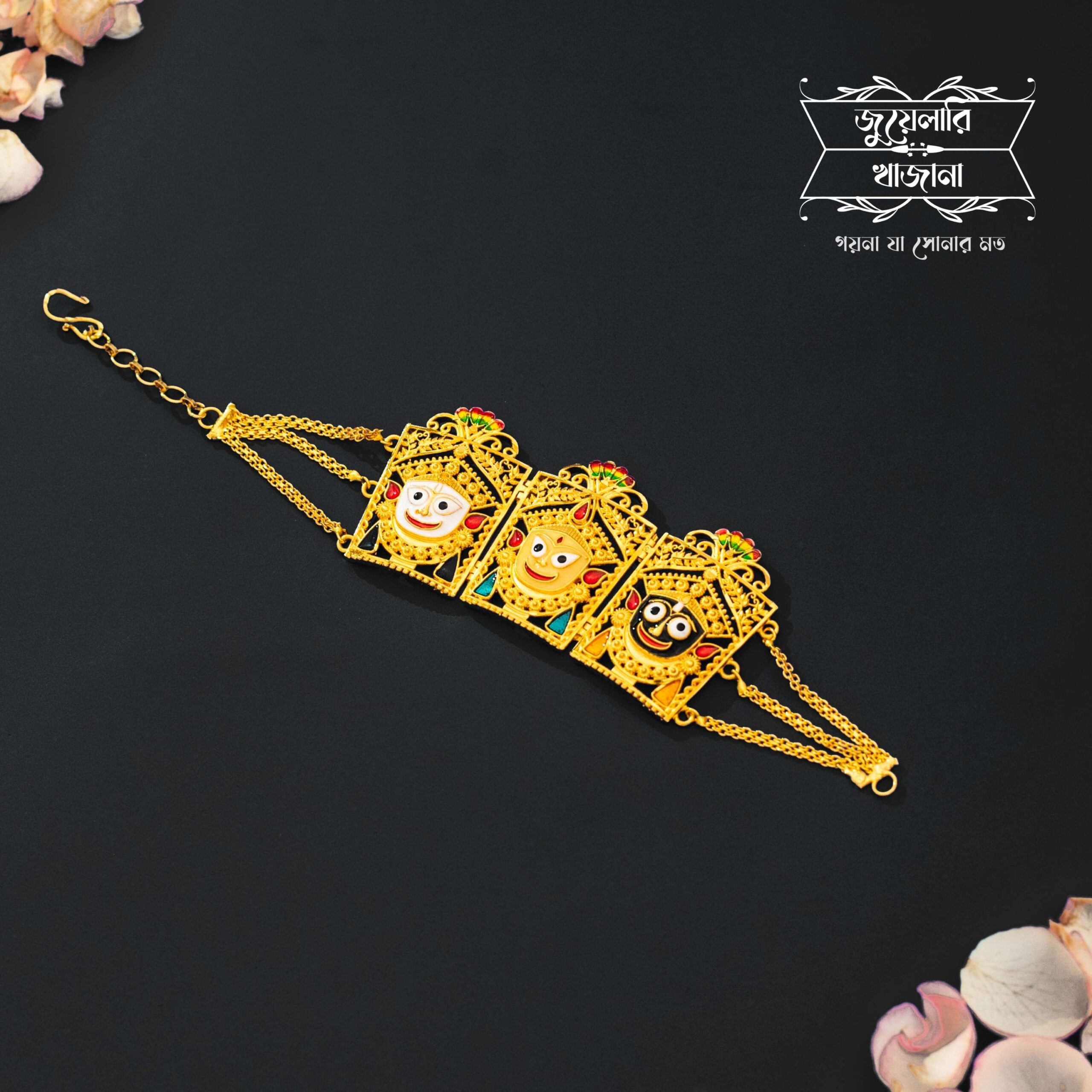 Invoke divine blessings with the Premium Gold Plated Tridev Mantashaw, a timeless tribute to the sacred trio of Jagannath, Balaram, and Subhadra. Crafted with care and precision, this mantashaw features traditional motifs drawn from Rath Yatra heritage and old-school Bengali artistry.